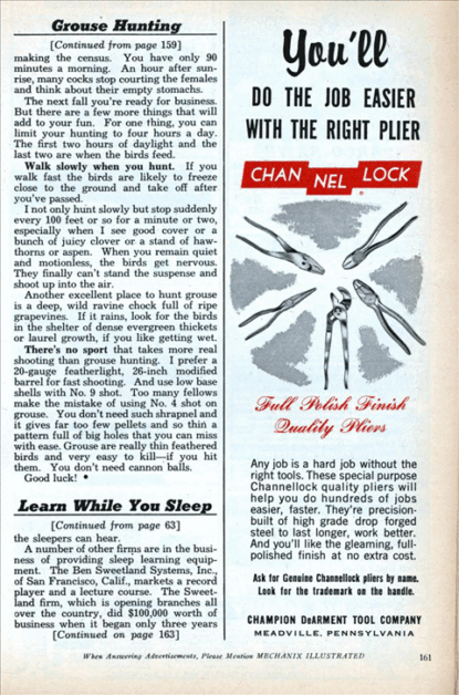 The second is a “memory trainer,” actually a tape recorder and playback device with automatic gadgetry attached. Here a student makes his own recording of anything he wants to learn—speech, sermon, vocabulary, fact, figures. There is the same clock setup through which he can play it back when he wishes. Both machines are equipped with under-pillow speakers which only the sleepers can hear.